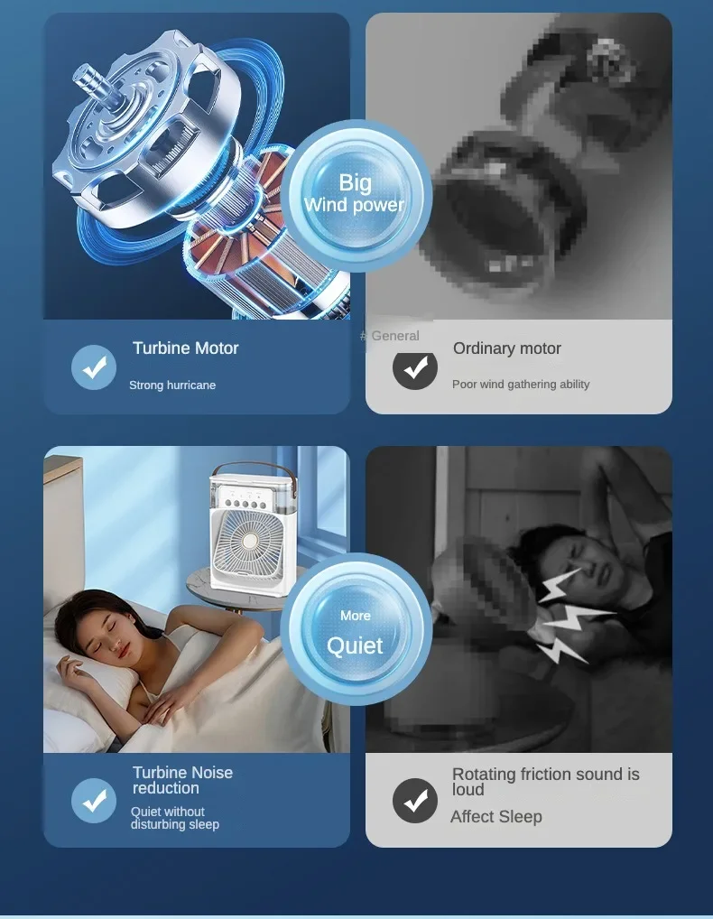 2. The large-capacity water storage tank is on the top, open the top cover to add water, or add ice cubes, the cooling effect is better!